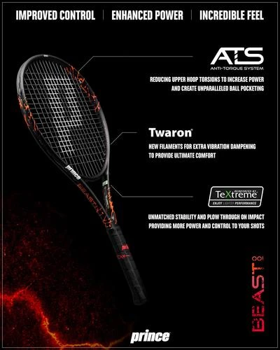 The Prince Beast 100 300g is an excellent racket that suits tournament players and offers a maximum of power, which you can easily keep under control. Tame the beast and beat your opponent! The innovative TeXtreme technology is a special feature of the Prince Beast 100 300g racket. This not only improves your strength but also your touch and spin are. The racket lies even more comfortably in your hand and power transmission is perfect. Product Details TeXtreme – Spread tow woven laminates are developed with a thinner structure and straighter carbon fibres to create a composite material that is 20% lighter in weight with improved stiffness. Positioning TeXtreme in the shaft and lower hoop with a 45-degree orientation reduces frame twisting by up to 25%. The result is unparalleled stability and plow through on impact providing more Power AND Control on your shots Twaron – With added Twaron filaments for extra frame vibration dampening to give the most comfortable version of TeXtreme ever ATS System – The new Anti-Torque System (ATS), TeXtreme & Twaron, at the 2 & 10 o’clock positions to help reduce upper hoop torsions. This results in increased power and unparrelleled ball pocketing Power-Rail – Additional stiffness constructed in lower part of the hoop to reduce lateral "twitch" deformation and raise sweet spot of highest rebound Extended Bridge – Designed for elongated main strings to improve spin control O3 – Prince’s O³ Ports help players generate more power without changing the racquet’s head size and string pattern. This unique technology, only available in Prince racquets, increases string movement resulting in a larger sweet spot and improved tension maintenance