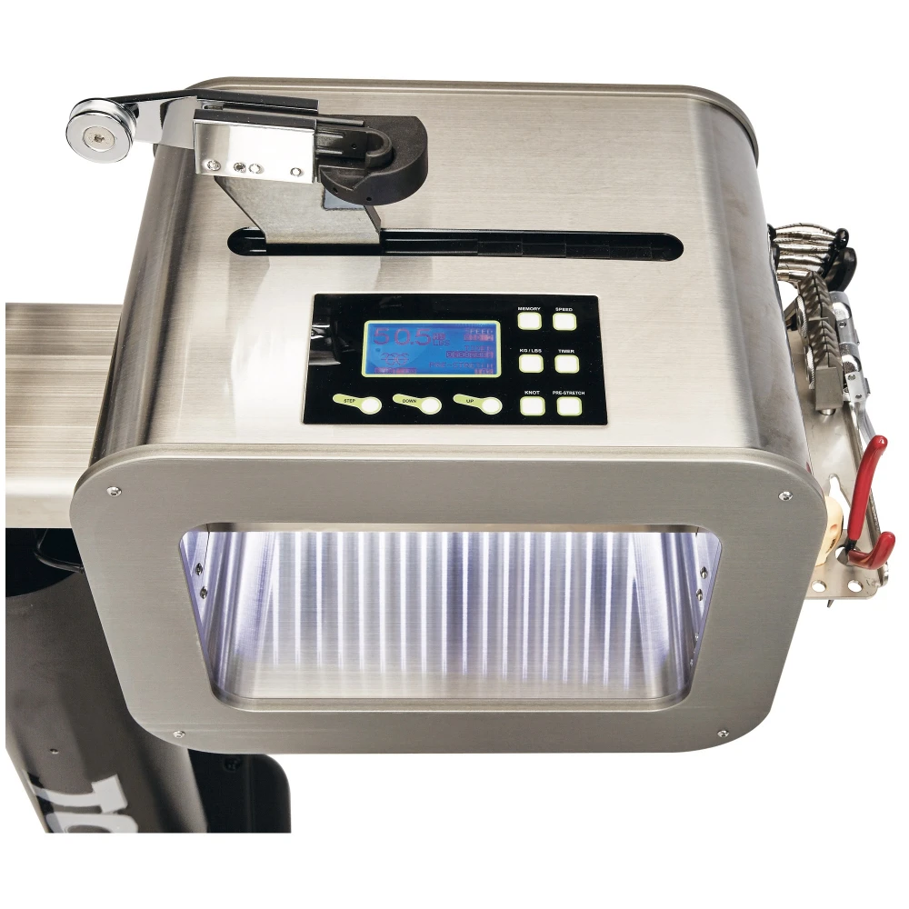 Full electronic instruments for 6 pull speeds, 4 levels of pre-stretch, Knot function, 8 programmable memory settings, and precision tension control from 10-90 lbs in .1 increments. Microprocessor controlled True Contant Pull technology.